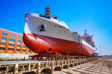 # 提前一個月交付1100TEU集裝箱1號船,后續(xù)船全部按照生產(chǎn)節(jié)拍有序推進;2號船已成功離廠、3號船和4號船已成功下水,快速、連續(xù)、批量化的新造船模式效應不斷凸顯。