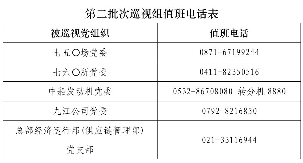 巡視期間,集團公司黨組巡視組設置值班電話和聯系信箱,主要受理反映被巡視黨組織領導班子及其成員、下一級黨組織領導班子主要負責人和重點崗位領導干部問題的來信、來電、來訪,重點關注違反政治紀律、組織紀律、廉潔紀律、群眾紀律、工作紀律、生活紀律以及巡視整改等方面問題反映。第二批次巡視受理信訪截止時間為8月18日。